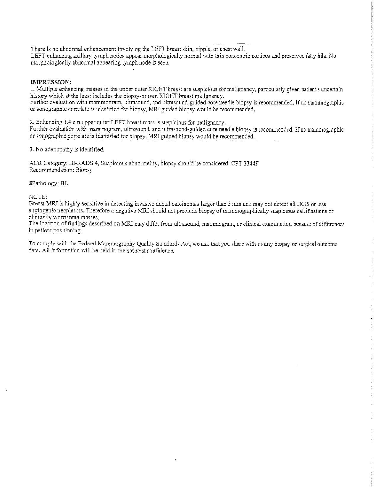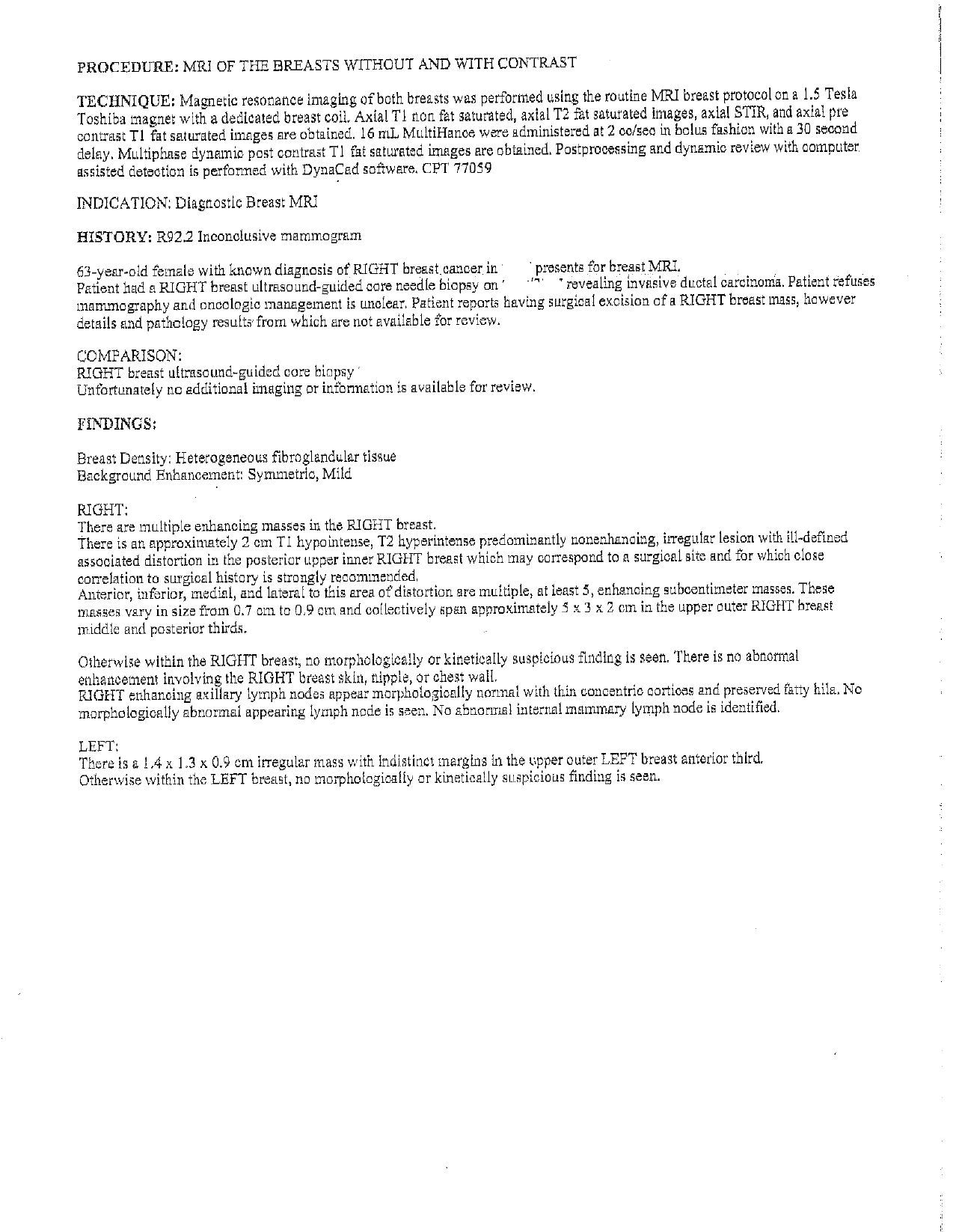 63 YO female s/p excision of a right encapsulated adenocarcinoma localized at 12pm. Patient refused additional treatment or monitoring. She presents 1 year later requesting breast thermography. Findings revealed hypervascularity in the right breast most pronounced at 11pm, inner ring, & diffusely in the left breast with a closed loop pattern at 11pm. Hyperthermia was seen in the right breast at 12pm & in the left breast at 11pm. Patient then agreed to an MRI that revealed multiple enhancing lesions on right & an irregular mass with indistinct margins in the upper outer left breast, anterior third. There after patient agreed to consultation with an “open minded” oncologist.