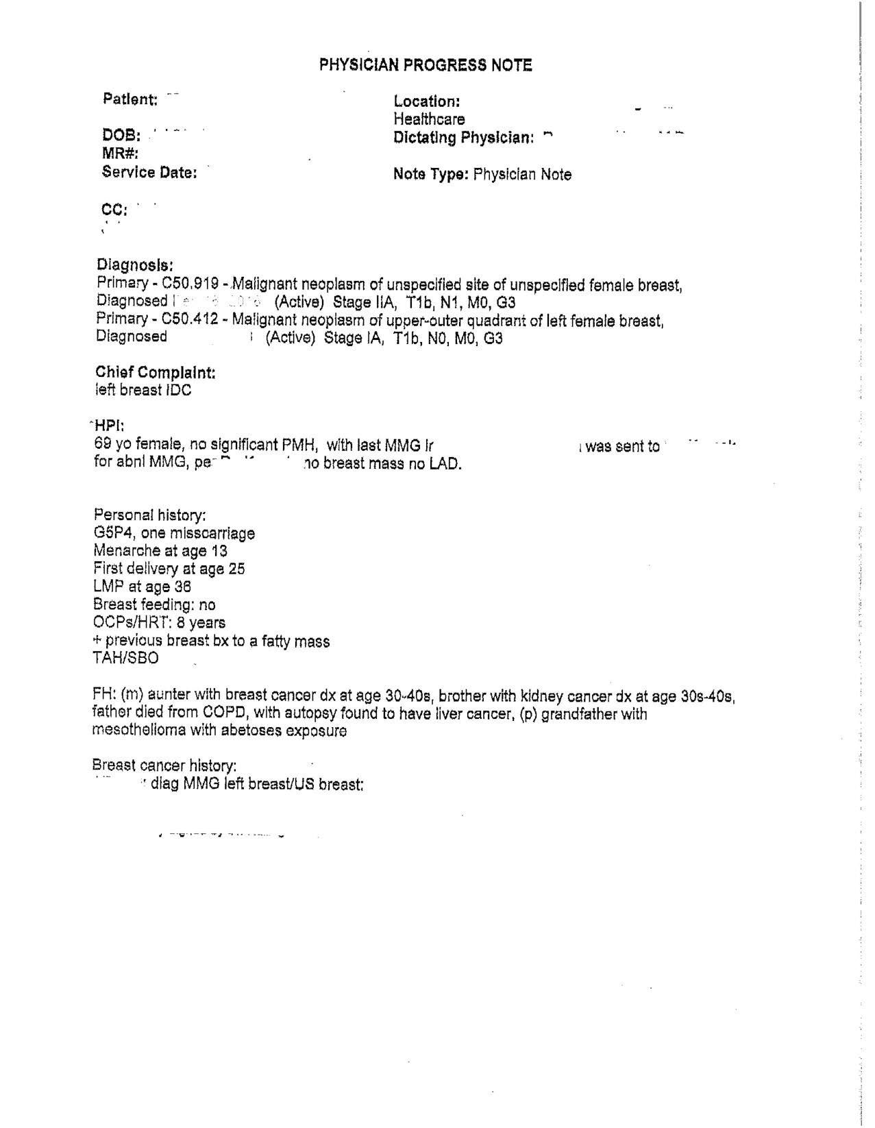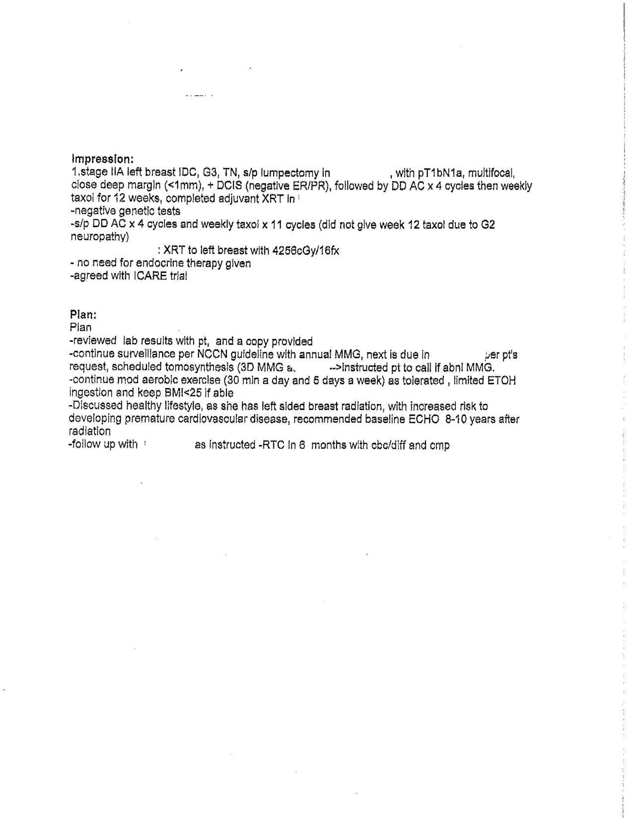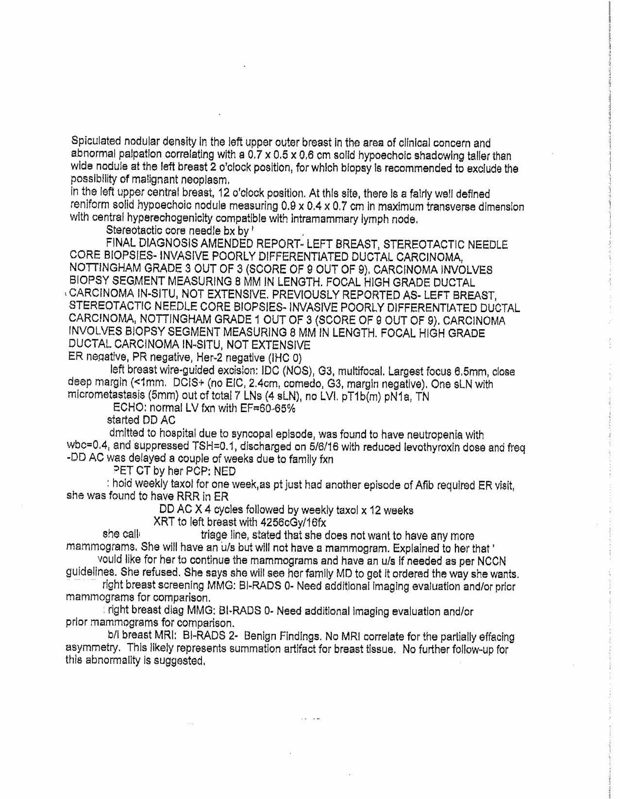 68 yo female presents for breast risk health assessment. PMH is positive for left breast poorly differentiated ductal carcinoma treated with excision (scar at 12 noon) and chemotherapy. Radiation was declined. She refuses additional mammograms. Breast Theromography findings five months post-excision include was increased nipple temperature, hypervascularity at 10-2, hyperthermia at 12-2, and less dramatic hyperthermia in the axilla on left. There is a single afferent mammary vein traversing from 1 to 12 on the right breast. Thermographic impression is right Th2 and left Th5. Six-week surveillance was recommended along with follow up with their primary breast health provider.