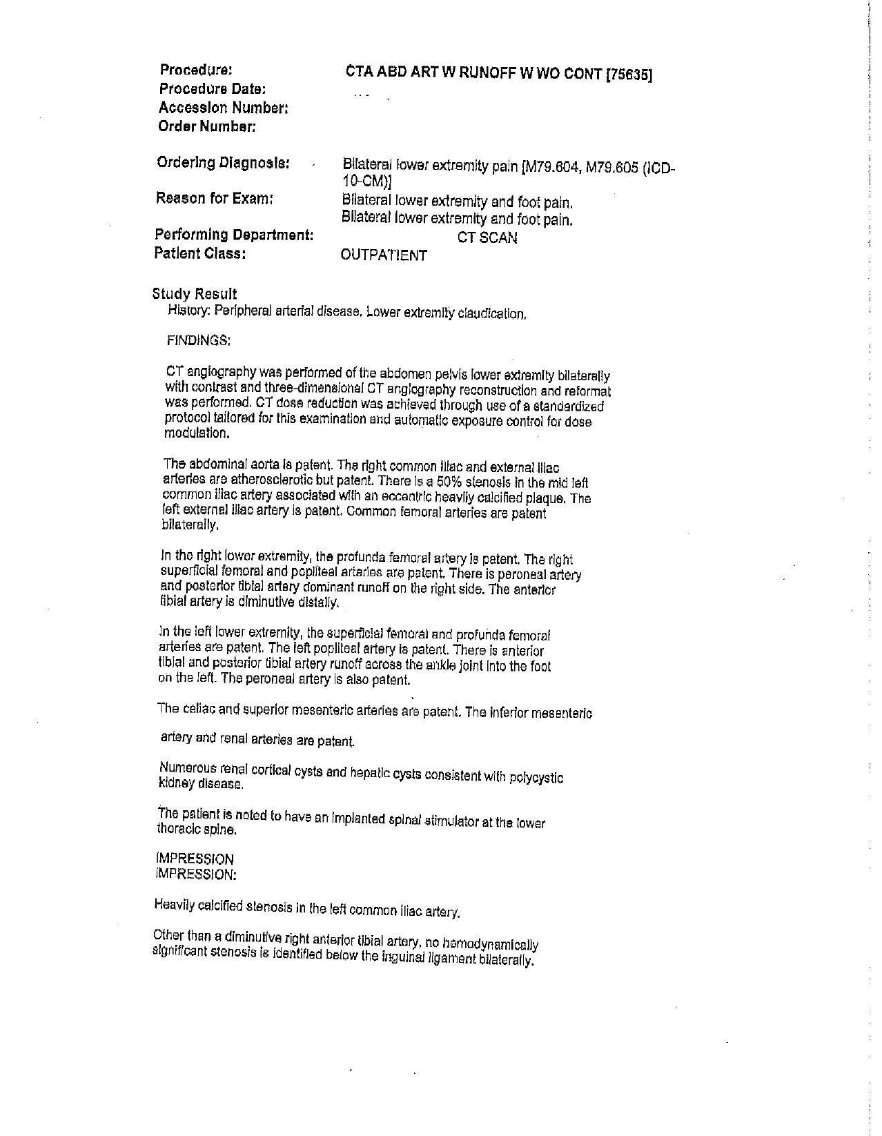 64 yo male with a CC of BLE pain below the knees. PMHx was positive for peripheral neuropathy and 4+ DJD of the right knee. Co-morbid disease includes HTN, CVDz, gout, sleep apnea, colectomy secondary to diverticulosis, and abdominal hernia repair. After failed attempts to provide relief Cold stress SSR thermology was obtained. Findings include tortuosities consistent with varicosity, localized heat over and lateral to the right knee, and an asymmetry pattern over the abdominal wall. Thermographic impression restated findings. Abdominal CT scan revealed severe left common Iliac Artery stenosis. DXUS of the right knee confirmed complete loss of joint space cartilage.