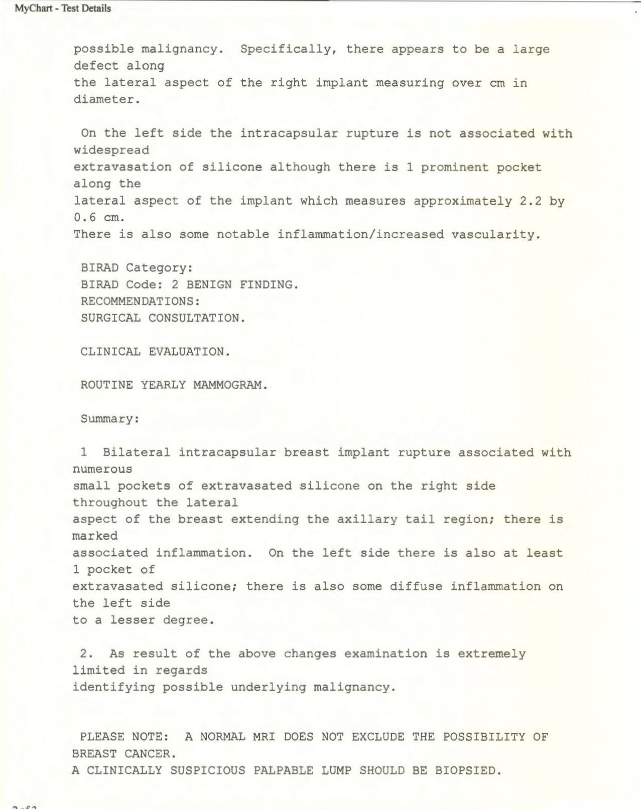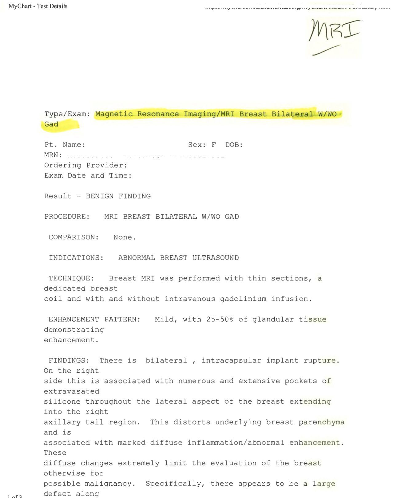 Sudden change in the R breast was noted. Report by physician suggested followup with Ultrasound and MRI with contrast to rule out implant rupture or neoplasm